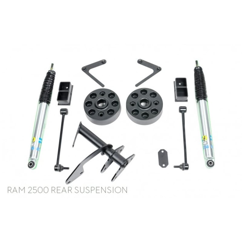 The Formula - AEV's Ram DualSport Suspension Systems focus on optimizing geometry and custom shock tuning to deliver the best on and off-road performance. This starts in the front end, where Rams come standard with dozens of different spring rates on HD trucks, depending on power train, wheelbase, and more, so offering a generic "gas" or "diesel" spring would have been a huge compromise in ride quality and/or load carrying capacity. AEV retains the factory front coil springs mated to 3" cast aluminum coil spring relocation spacers to achieve the additional lift height. This takes advantage of the full range of factory spring rates and frequencies while still providing the necessary front end lift.