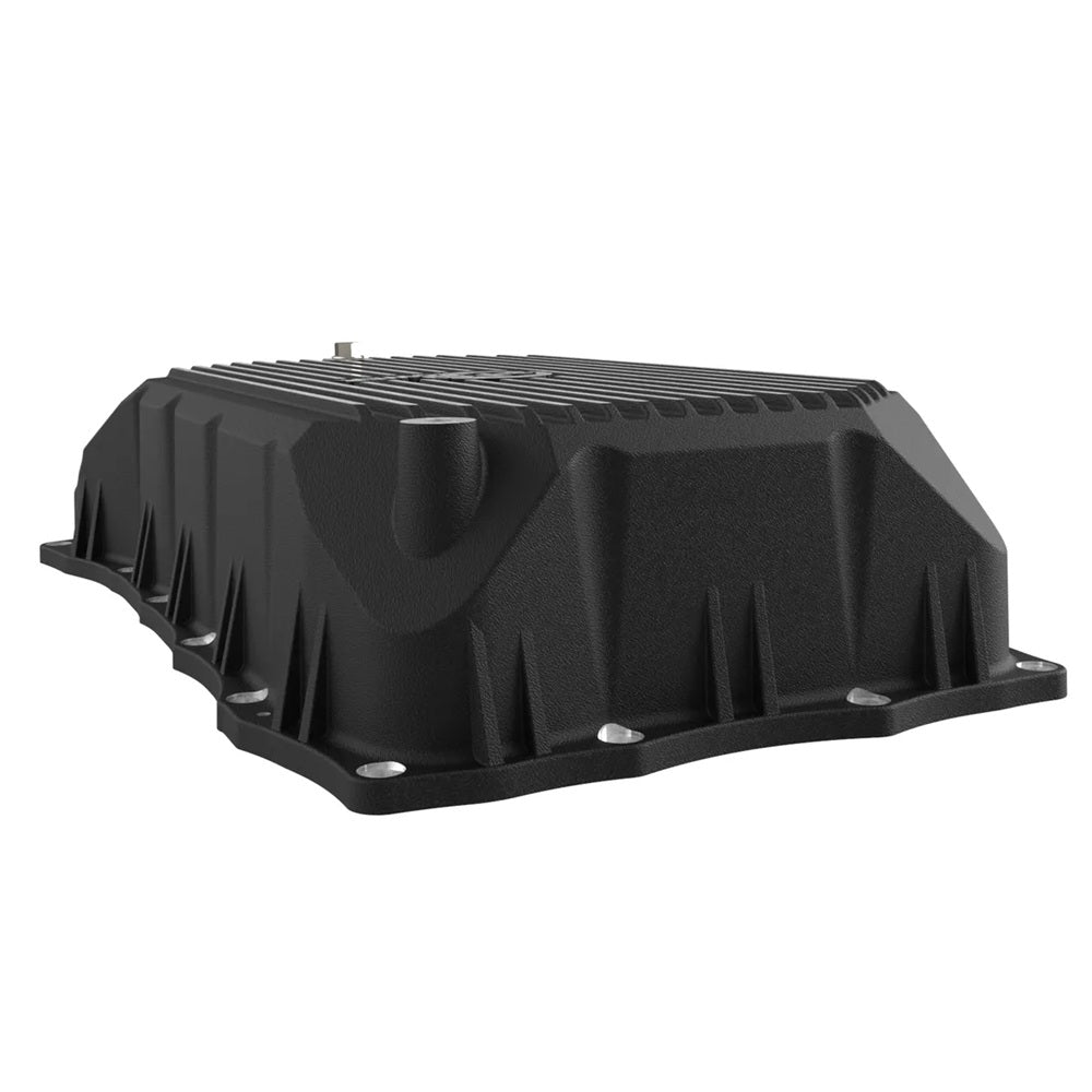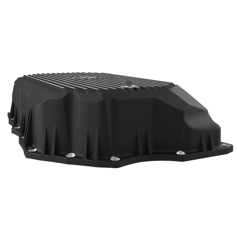 Demanding more from your transmission? This heavy-duty transmission pan delivers. Featuring an increased oil capacity of approximately five quarts over stock, integrated cooling fins, and a magnetic drain plug that captures loose metal particles, protecting the transmission from wear and tear. It’s built with thick walls for extra strength and a black powder coat for durability and appearance. You’ll also be able to get a more accurate fluid level reading through its integrated standpipe.   Features Increased Oil Capacity: This transmission pan has an increased oil capacity of approximately five quarts over stock for better performance over a longer duration. Powder Coat: The black powder coat on this pan protects from outside conditions with a sleek look. Built-in Internal/External Fins: Built-in internal and external fins transfer heat from the oil to the outside air for maximum cooling. Magnetic Drain Plug:  This pan incorporates a magnetic drain plug to capture loose particles for maximum protection. Integrated Standpipe: Integrated standpipe ensures accurate fluid level checks during the filing process.
