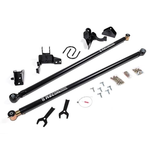 Traditional traction or ladder bars are a great addition for those looking to gain needed traction to prevent against axle wrap and wheel hop. However, they also have a negative side effect in which they limit your suspension's ability to articulate, causing a degradation of performance when off road. That has all changed with the RECOIL Traction Bars! BDS Suspension's RECOIL Traction Bars are a revolutionary spring loaded traction bar system engineered to improve traction and limit axle wrap without negatively affecting suspension travel or ride quality. These next generation RECOIL traction bars offer you the freedom to tune the spring tension for optimal performance on-road, off-road, towing, or competition pulling. These traction bars can be used on stock height or lifted trucks and work with both lift blocks and replacement leaf spring kits. They use a full floating design that won't bind up allowing the full range of wheel travel without limiting articulation. These RECOIL traction bars are built to the highest standards for the ultimate performance on and off-road. The bars are fabricated from 2" OD x 3/16" wall steel tubing with a threaded bung welded in toward the axle and a CNC machined end at the frame. The axle mount uses the tried and true BDS large forged flex end and jam nut to take whatever abuse you throw at it. Utilizing a forged housing with large 1-1/4" -12 threaded shank, a single sided snap ring and 1-piece flex ball, the flex ends are capable of up to 15-degrees of misalignment in either direction. At the frame end the bar uses a durometer specific polyurethane bushing and free floats in the traction bar utilizing a pair of dual stage internal compression springs and UHMW polyurethane bearings. Both ends are greaseable and serviceable. RECOIL Brackets | Vehicle Specific - Fully assembled the RECOIL traction bars are 55" long and mount to the vehicle using fabricated 1/4" steel brackets. Bracket kits are vehicle specific. The frame brackets install by drilling mounting holes for the brackets while the axle brackets install using a set of u-bolts. The traction bars and mounting brackets feature a durable gloss black powdercoat finish. Adjustable Axle Wrap Control - These RECOIL traction bars are built to the highest standards featuring quick and easy adjustment while installed on the vehicle. To adjust spring tension, use the supplied spanner wrenches at the axle to loosen the jam nut. From there the main bar can be rotated to load or unload the springs at the frame side of the bar. Using the concave end of the wrench handle against the frame end check the location of the end of the main bar in relation to the notches on the wrench to verify the load on the springs, the shorter the distance the more loaded the springs are. Repeat this process on the other traction bar and use the wrenches to tighten down the jam nuts and you are ready to go!