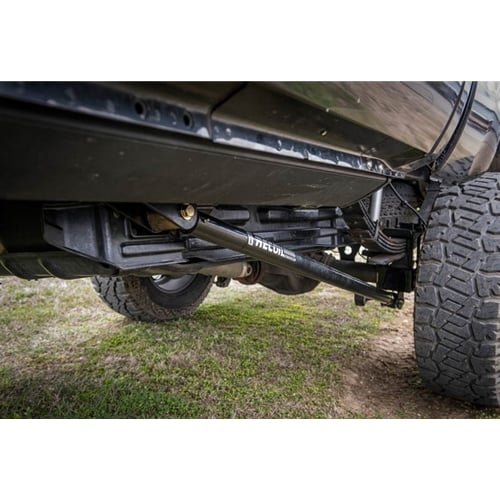 These RECOIL traction bars are built to the highest standards for the ultimate performance on and off-road. The bars are fabricated from 2" OD x 3/16" wall steel tubing with a threaded bung welded in toward the axle and a CNC machined end at the frame. The axle mount uses the tried and true BDS large forged flex end and jam nut to take whatever abuse you throw at it. Utilizing a forged housing with large 1-1/4" -12 threaded shank, a single sided snap ring and 1-piece flex ball, the flex ends are capable of up to 15-degrees of misalignment in either direction.