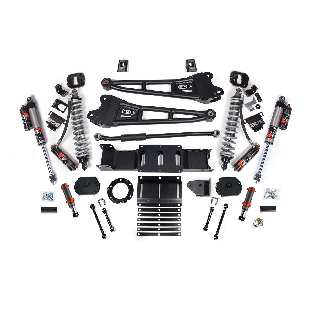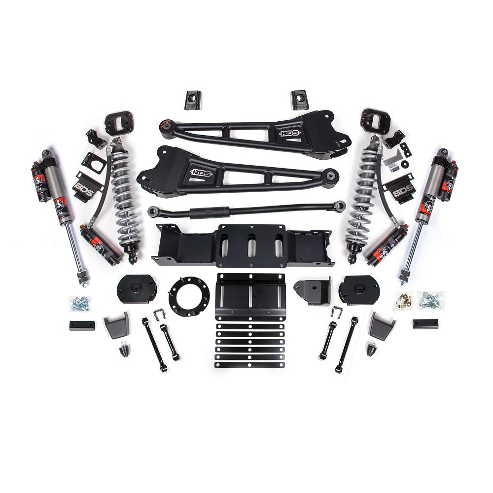 Looking to push your Ram 2500 to some of the best performance a suspension can get? For those who want the ultimate upgrade to your truck, BDS Suspension has created the Coil-Over Conversion 3" Lift Kit with Radius Arms. No matter the conditions or the reasons you can be sure when you look down a road you have never been down that you can drive with confidence. The full-stock setup is replaced with serious hardware that you can both see and feel behind the wheel. Heavy-duty radius arms give you better articulation and toughness and on top of that you get a full BDS Coil-Over Conversion Kit outfitted with FOX Performance Elite coilovers. What do coilovers give you? Precision damping, supreme control, and a plush ride quality you won't get anywhere else. Does everyone need coilovers on their truck? Honestly, no but are you just anybody? Be ready for any terrain and make your truck the envy of the county with BDS Suspension 3" Radius Arm Lift Kit with FOX 2.5 Coil-Over Conversion!