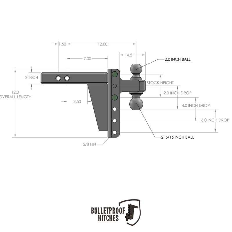 Upgrade your towing equipment with this BulletProof Hitches 2.0" Extreme Duty 6" Drop or Rise Hitch. BulletProof Hitches worked hard to create one amazing Hitch that does the work of 10. BulletProof hitches are extensively tested and exceed SAE-J684 testing requirements. They are built with such high standards that they have never had a single failure.