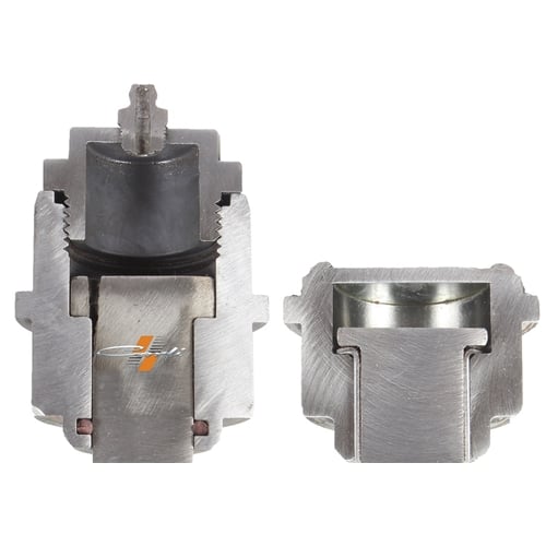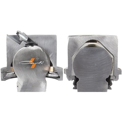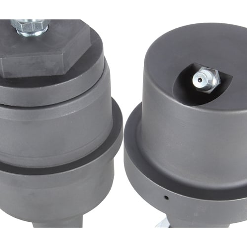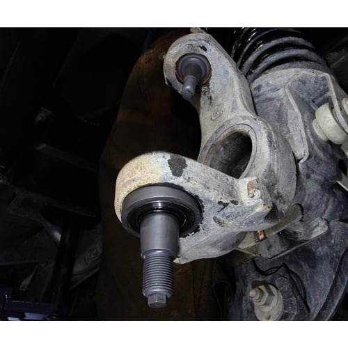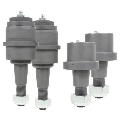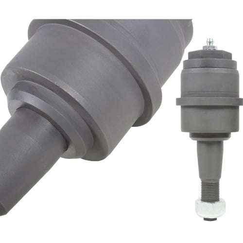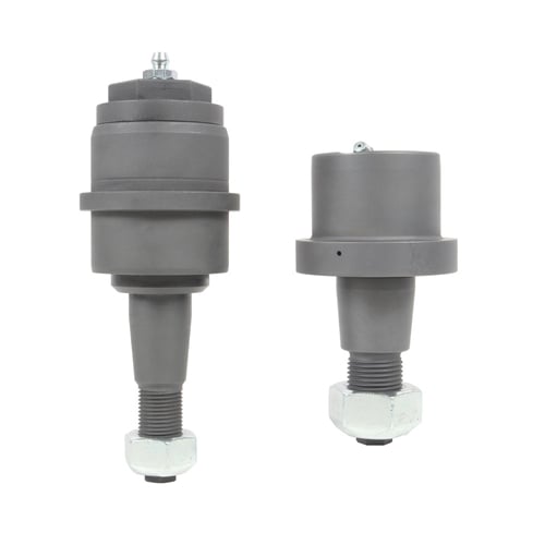 The Carli Joints are similar in design in that they utilize the same style of a floating king-pin upper, but with several improvements in design. You'll notice the Carli ball joint has a pin and housing, but the "hat" of the pin contacts the housing. This adds a second wear surface to further distribute the load applied laterally to the ball joint while providing the same failsafe as a factory ball joint, ensuring the pin cannot be pulled through the bottom of the ball joint housing. Further, there is no sleeve isolating the wear surfaces, eliminating the point of failure. The upper cavity's size is increased to hold a larger grease reserve and the threaded cap both allows access to the cavity and pin if needed and allows servicing through its zerk fitting. You'll also notice the channel in the pin itself providing a path for grease to migrate to the wear surface. At the bottom of the housing, a Viton Seal prevents the environment from entering the ball joint.