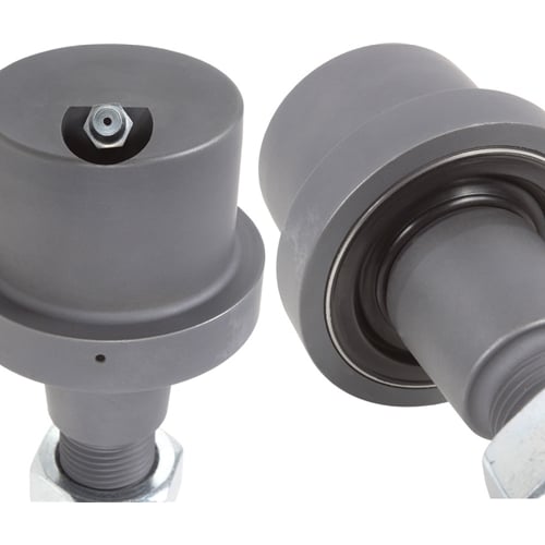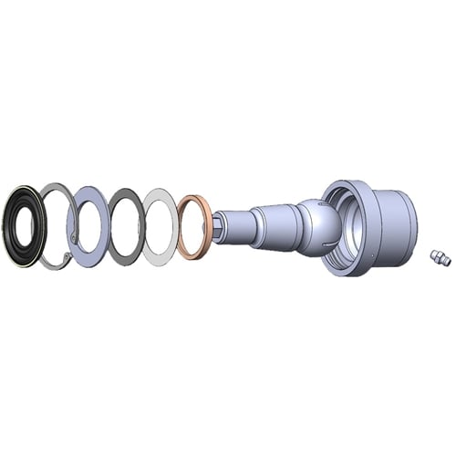 The improvement on this design begins with the ability to service the joint. The Zerk fitting is recessed into the top of the joint and protrudes at an angle to be aimed forward and slightly inward to allow access to the fitting without needing to disassemble anything. In the cutaway, you can see the channels machined into the Carli ball surface conducive to grease migration. Again, you'll see no liners of any kind. At the top, a bronze wear surface preloaded by a disc spring, safety washer and snap ring ensures the ball joints wear surfaces are always held tightly together for optimal performance.