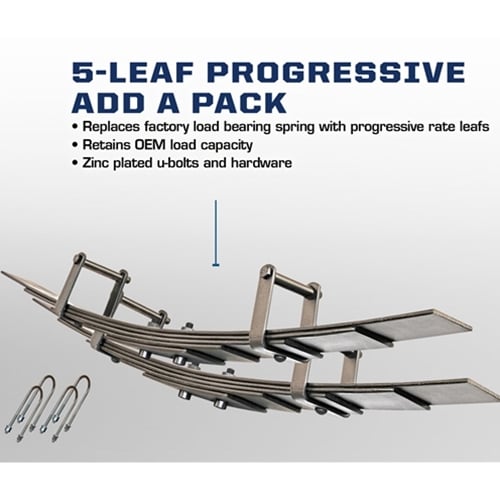 Looking to improve the ride quality of your truck but not take away from the payload capacity? Air bags are an option and have many benefits but with that come complexity and cost. A simpler solution is to use an Add-A-Pack. Not to be confused with an Add-A-Leaf which ADDS leafs to your current pack and increase the tension/arch to GAIN more capacity and lift, the Add-A-Pack simply replaces your factory lower overload leaf making your spring pack more progressive. By making the spring pack more progressive, it's able to better dissipate shock loads through the suspension. Improved ride quality is achieved by helping take the edge off of large potholes and dips while smoothing out small chatter on the road. The 5 leaf add-a-pack will provide 1" of rear lift and is perfectly suited to help level out trucks with 3" of lift in the front of their truck. Additionally, you can fine tune your lift height by add/removing the spacer leafs that are bolted to the factory pack. Most people opt to leave these in for a leveled look with a 3" kit but if you have a 2" front leveling kit, removing the two or three small factory spacer leafs can help achieve a truly level stance.