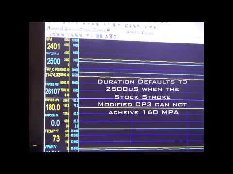 A: A common rail fuel system is most easily related to supply demand. Commanded main injection duration, the demand, while the CP3 is the supply. The bigger the injector and/or longer the commanded duration, the higher the demand. CP3's are limited to what they can supply (Volume) based on displacement RPM. As demand increases beyond the CP3's ability to supply, then fuel rail pressure starts to drop.
