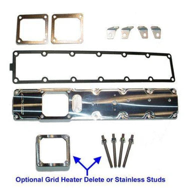 The Air-Boss plenum kit also includes a shortened grid heater delete block to maintain the factory IC piping to intake manifold connection geometry . Maintaining this geometry makes the Air-Boss plenum compatible with ALL aftermarket intake manifolds and the stock mounting hardware.