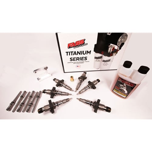When it comes time to replace the injectors in your Cummins, wouldn't it be nice if you could get everything you needed in one complete package? Of course it would, and that's why we've put together this complete package that will deliver you a set of Industrial Injection 60 horsepower injectors, injector connector tubes, connector tube removal tool, FASS Titanium Signature Series 100 GPH Lift Pump, GDP Fuel Filter Housing Eliminator Bracket, and even a bottle of F-Bomb fuel additive. All you need to supply are a pair of hands and some basic hand tools to complete the job.