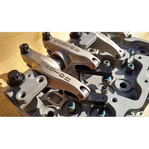 With minimization of deflection being the main concern, they incorporated one of their proprietary tool steels into the rockerarm bodies. Further, they use a multi-stage heat treatment process to core harden the bodies. Then, the bodies are nickel plated to prevent any contamination. To aid in lashing the valves a simpler process, they have broached the adjusting screws to accept an allen wrench, instead of the slot for a flat head screwdriver. Manton's Top Fuel proven pin and roller combination on the valve side are integrated, which reduces side thrust on the valve by removing the scrubber from the rockerarm. Going away from the shoe style rockerarm required a conversion of the geometry theory, allowing them to keep the factory rockerarm ratios and utilize the existing camshaft.