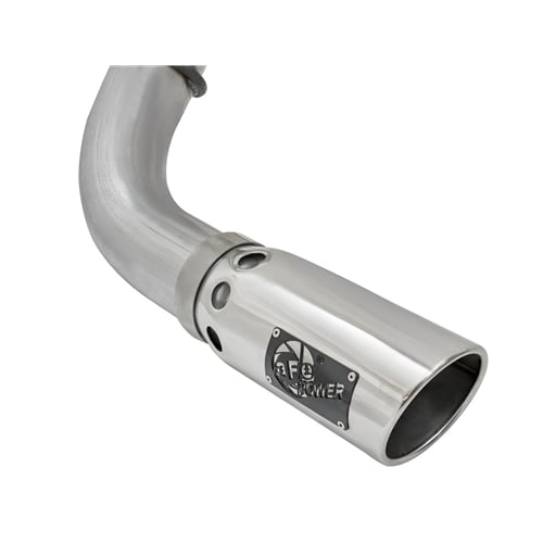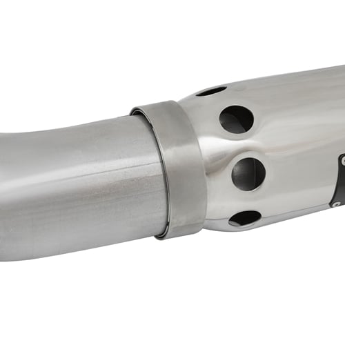 5" Diameter Polished Intercooled Tip: Finishing off the exhaust is a 5" diameter, polished, stainless steel slash cut tip with intercooling vents designed to reduce exhaust gas temperatures at the tailpipe. A unique stainless steel laser-cut aFe Power logo plate is riveted on for an aggressive style.