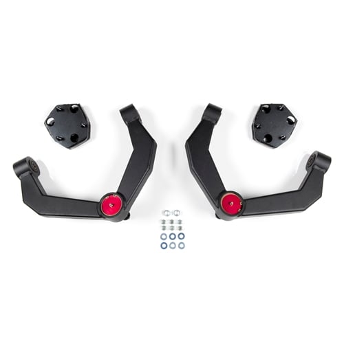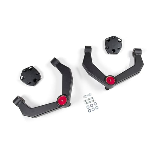 The UCAs are boxed separately (#D2301) and can be used with other leveling kit equipped trucks. In addition to the UCAs, the kit comes with strut top spacers that properly reposition and pitch the factory strut in order to gain lift without the chance of the strut rod rubbing on the factory upper isolator assembly (creating a squeak). The strut spacer works within the limits of the factory CV shaft so they do not bind at full suspension extension. The newer generation trucks have longer CV shafts than the 06-11 models, this allows Zone to run 2" of lift safely without a differential drop.
