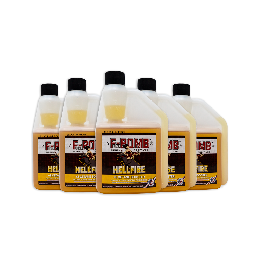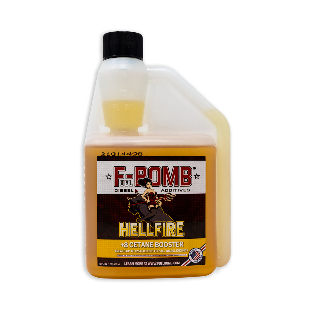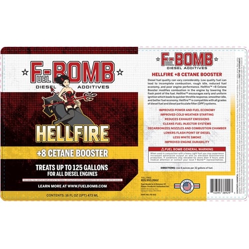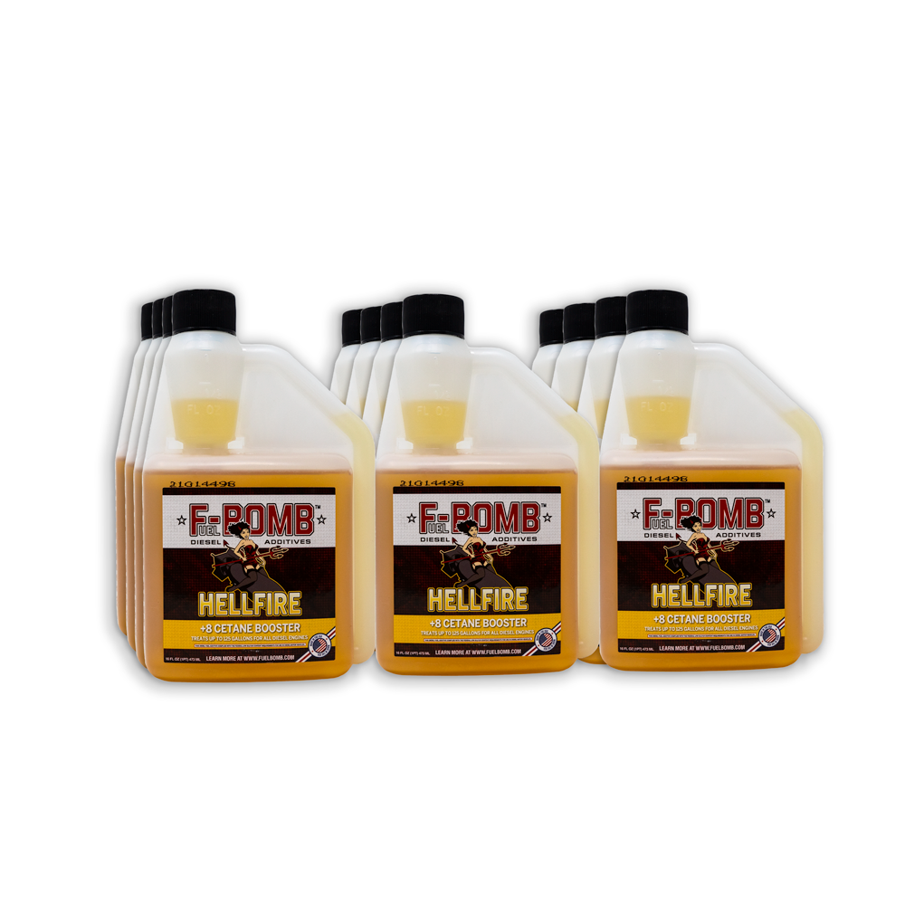 The Most Powerful Diesel Fuel Additive on Earth! Fuel Bomb's HELLFIRE is a unique proprietary blend of chemicals to help your diesel run more powerfully. If this is your first time trying Hellfire Diesel Additive, pick up a bottle to see for yourself how well it works to improve your power and fuel economy. However, we also offer Hellfire by the case of 6 or 12 for those that know how well it works and want to save some on the per bottle price and shipping costs.
