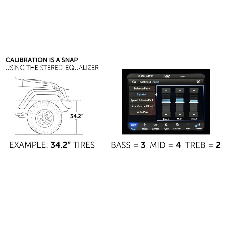 After installing AEV’s Programming Harness (included), ProCal SNAP simply plugs into your vehicle’s OBDII diagnostic port and interfaces with the user through the audio system equalizer. After inputting the necessary numerical values for the tire size or gear ratio through the audio equalizer (example: 35.5” tall tire = bass 3, mid 5 and treble 5) the settings are saved by pressing and holding a combination of buttons on the steering wheel. It’s that easy…in fact, some might say it’s a SNAP!