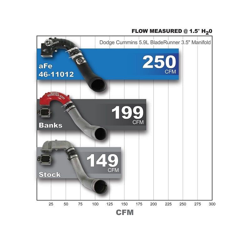 Anytime airflow can be improved in or out of your engine its going to benefit you. It is astonishing on how restrictive factory parts can be especially on the intake side. Massively improve intake air flow up to 32.9% in your 5.9L Cummins with the AFE BladRunner Intake Manifold with Grid Heater Delete. This intake manifold features AFE's MDV or Multiple Directional Vane technology that guides air through the manifold maximizing airflow and deletes the factory grid heater for even more flow. This manifold is constructed out of cast A356-T6 aluminum and uses a internal bolt design that also increases flow and provides a solid seal. The AFE BladeRunner comes with 5 ports (2 are tapped at 1/8 IN NPT) for gauges, water-methanol injection, or nitrous injecton.