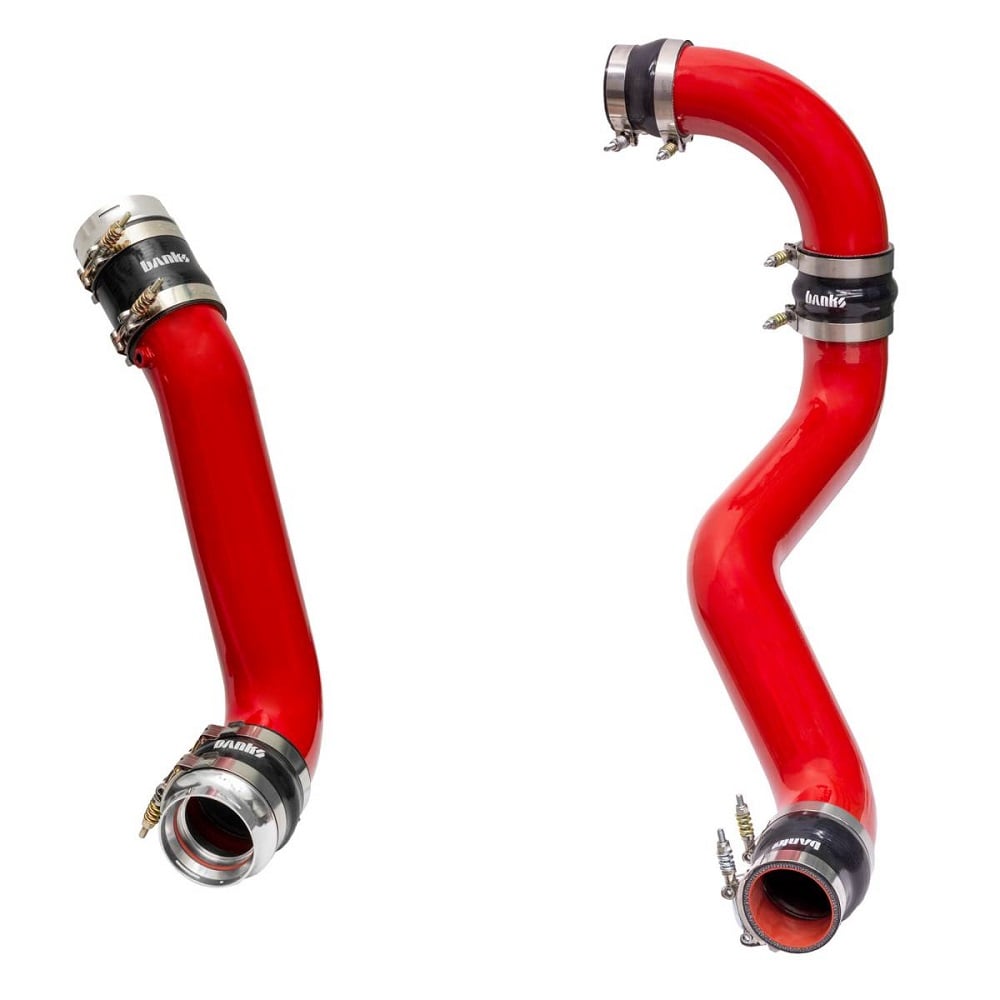 Have you upgraded your L5P with a cold air intake, maybe a programmer, but looking for some more power and boost? The factory intercooler pipes on each side of your intercooler are a measly 2.5" diameter and built from a combination of plastic, rubber, and metal, making them highly susceptible to cracking, leaving you stranded on the side of the road. Banks massive 3.5" boost tubes are the largest on the market, flowing more air than stock. Smooth mandrel-bent tubes deliver more air to your engine while reducing boost pressure loss resulting in quicker turbo spool and more power. Made of high-quality aluminized steel, Banks Boost Tubes allow for a quicker turbo spool by improving boost pressure retention (increasing air density) between turbo, intercooler, and intake resulting in maximum horsepower.The Banks Tube Upgrade Kit works with the stock Duramax intake elbow and intercooler by using proprietary high-strength 5-ply silicone couplers and unique to the 2020-2024 model, a pair of billet aluminum cold-side adapters. These couplers for the intercooler connection and the throttle body openings, are specially made for the airflow requirements on the L5P and feature a venturi-like taper on their inside diameter maintaining boost pressure and volumetric flow. INDUCTION PERFECTIONRevised for the 2020-2025 L5P, Banks Power has looked at the new design restrictions and engineered an induction solution to fit it. Even with the new engine bay layout with even tighter fitment under the hood, Banks engineers were still able to maintain a full 3.5" diameter on both the hot and cold side of their boost tubes. GOING THE EXTRA MILEWith the release of the 2020 L5P platform, GM has revised, moved, and updated several components throughout the engine bay. This includes not only the routing of the charge air pipes, but also material construction and connection mechanisms. Banks' 2020-2024 L5P Boost Tubes now feature a tapered billet coupler and quick connect on both ends of the pipe. No other manufacturer of intercooler pipes use this method of mounting. Banks engineers used CFD simulations to design the perfect taper and unique double parabolic shape on both ends to maximize airflow and reduce turbulence at the connection points. When you engineer the largest intercooler pipes out there, you have to make sure they connect properly and install easily too. DO IT RIGHTFor the 2020-2025 L5P, GM decided to go with a near full rubber hose design on the cold side. While this might make assembly easier at the GM plant in Ohio, the flex and swelling this hose provides leaves additional performance on the table. Banks boost tubes will never crack or dry out like the the rubber OEM Charge Air Pipes. Banks Boost Tubes are mandrel bent from aluminized stainless steel and designed to resist deformation from clamping force and other stresses for unparalleled durability and strength.