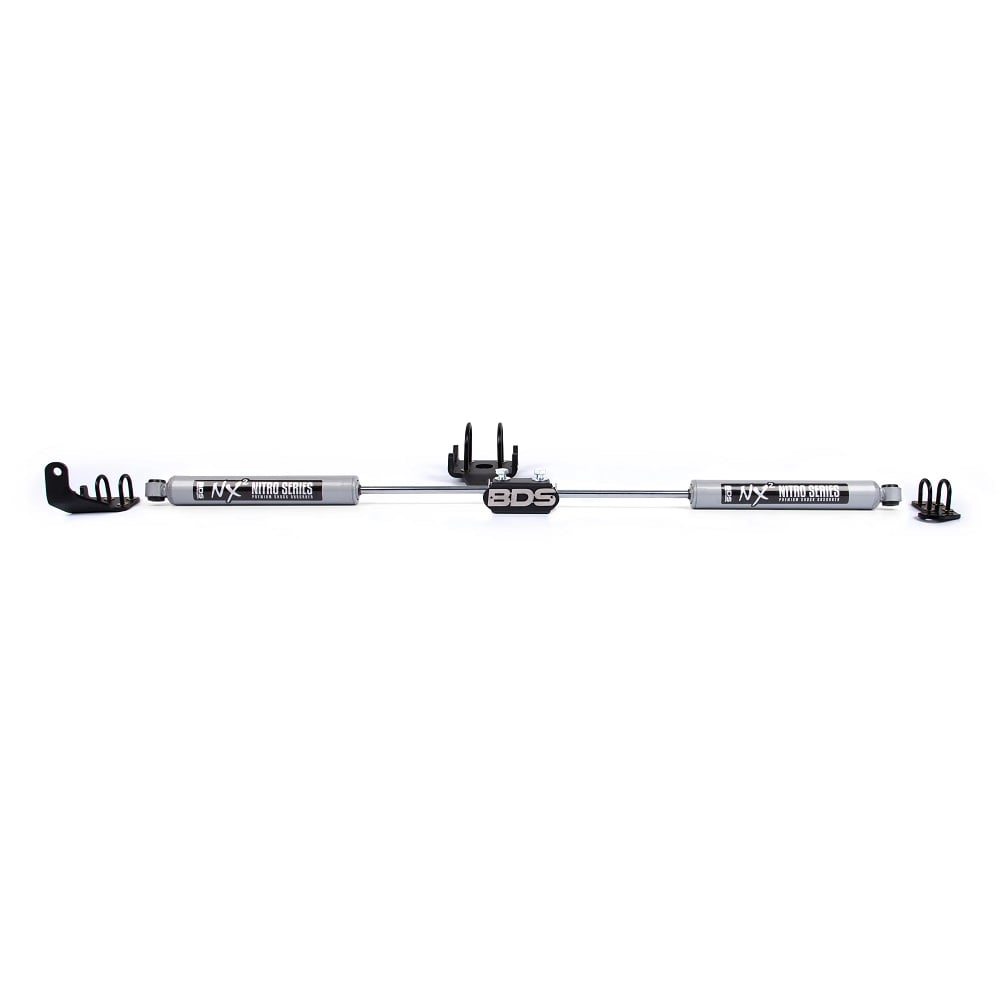 Take back control of your steering and improve on-road stability with the BDS Dual Steering Stabilizer Kit featuring NX2 shocks, designed specifically for Ram 2500/3500 (Y-style steering) 4WD trucks. Whether you're running oversized tires, towing, or just want a tighter, more confident steering feel, this dual setup delivers the extra damping your front end needs. FITMENT NOTE: Will only work with 3" front axle tubes. Built with heavy-duty, high-strength steel brackets, this system installs easily and works seamlessly with BDS lift systems. By reducing bump steer, steering shake, and road feedback, it helps extend the life of your factory steering components while giving your truck a smoother, more controlled driving experience. At the heart of the kit are BDS NX2 stabilizers, engineered with a pressurized nitrogen-charged twin-tube design and 10-stage velocity-sensitive valving. The shocks react instantly to terrain changes, offering improved stability whether you're navigating highways, job sites, or rough trails. With a 2-inch body, 1-3/8-inch fluon-banded piston, self-lubricating seals, and a 14mm hardened chrome shaft, these stabilizers deliver durability, corrosion resistance, and consistent performance in any environment. Why You’ll Love It Reduces steering shimmy, feedback, and bump steer Improves front-end component life and tire wear Helps stabilize trucks running wide or oversized tires Heavy-duty bracketry designed for long-term durability Vehicle-specific valving for optimal control High performance at a budget-friendly price If you want a more predictable, confident steering feel—on or off-road. This BDS dual stabilizer kit is one of the best upgrades you can make to your Dodge Ram.