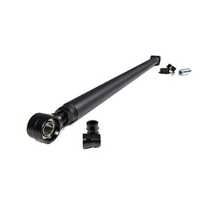 This rear track bar allows for fine adjustment of the rear axle position. It also provides better control of the rear axle by replacing the soft factory rubber bushings with high durometer polyurethane at the frame and a forged COM bearing joint at the axle. Both ends are rebuildable and the poly bushings are greaseable. Can be used with or without track bar relocation when needed for heights of 0-8" (relocation bracket needed for lift heights over 3").
