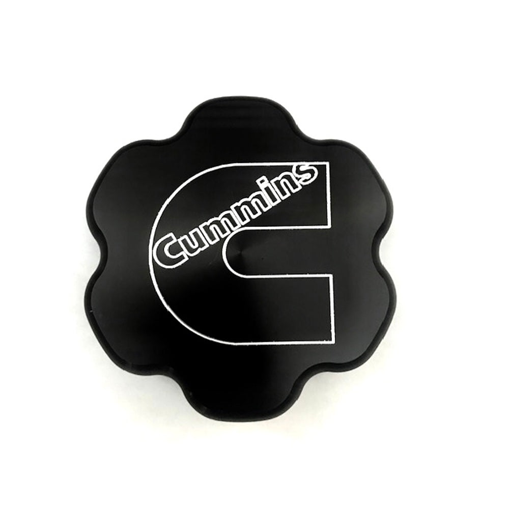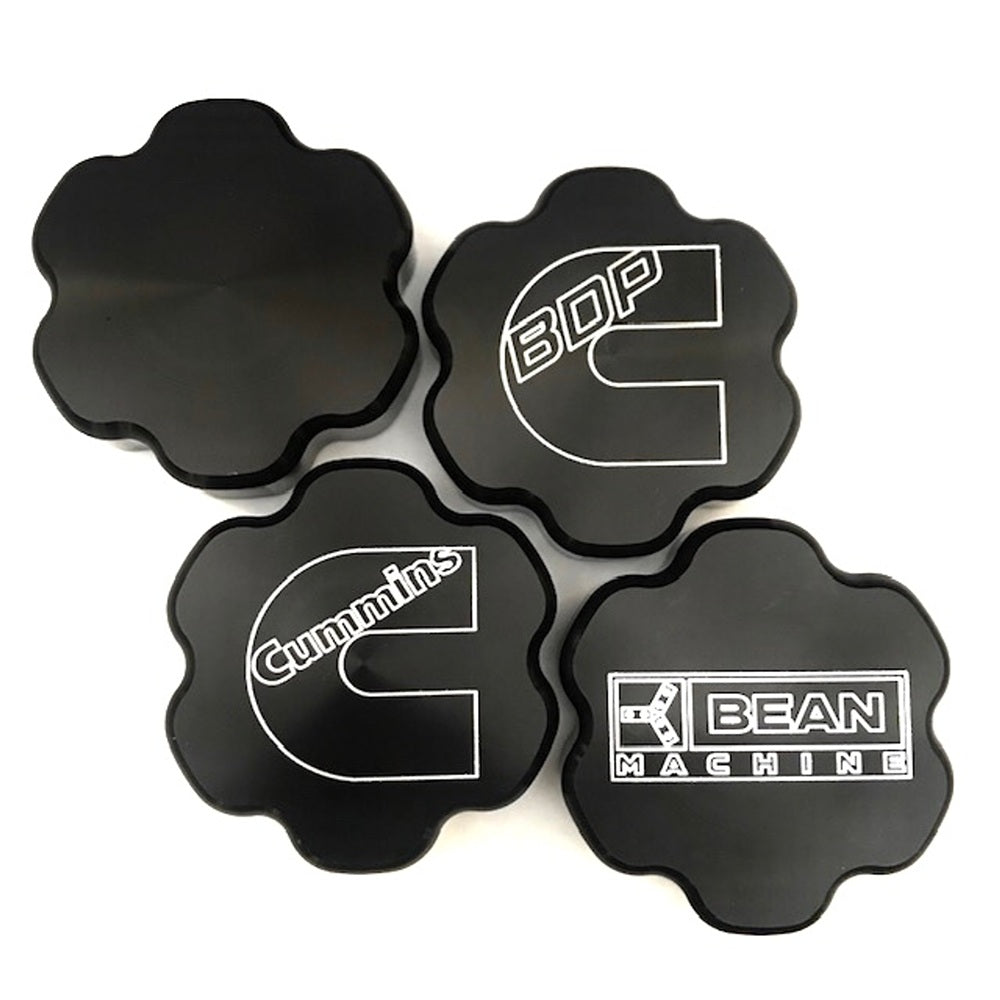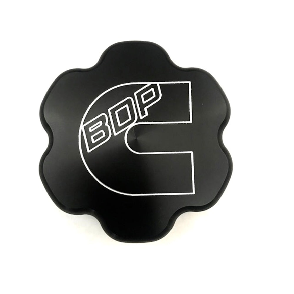 Dress up your engine bay by ditching that ugly plastic oil cap cover and upgrade with this black anodized cover from Beans Diesel. This cap reuses the bottom portion of your oil cap (the portion which screws into the valve cover) and replaces the plastic part. Available in plain black, with the Cummins logo, Cummins logo with "BDP," or the Beans Machine logo.