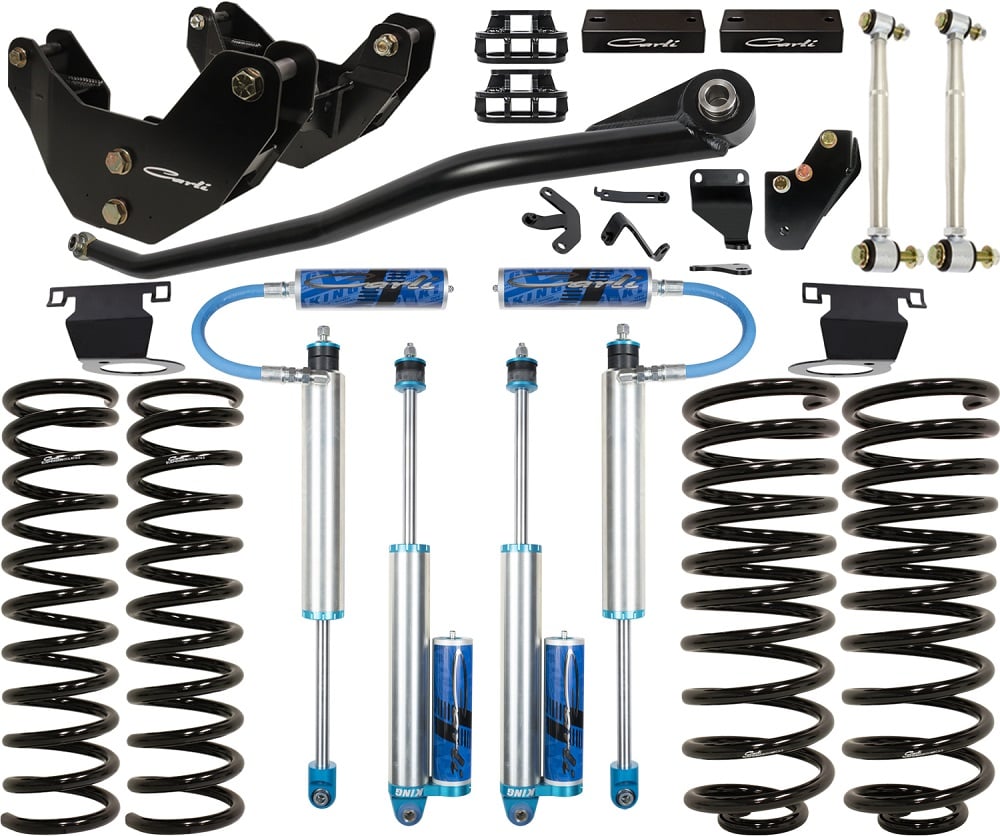 Your truck will sit 3”-3.5” higher in the front (cab configuration dependent) with 50% more suspension travel than the factory platform thanks to the taller, lighter rate coil springs. Carli offers two base kits separated ONLY by the rear coil springs with which they’re spec’d: