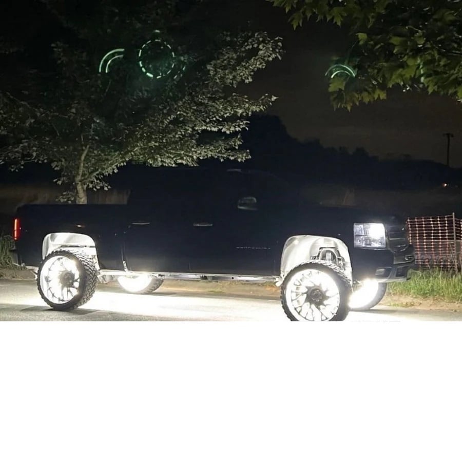 Need some monster light for your monster truck? Well, look no further with Customs Unlimited Ultra High Intensity 10-Row Wheel Lights. These lights kick off 36,000 lumens of light per ring and are entirely plug-and-play so they are easy to install. Entirely waterproof, these wheel lights can survive being submerged. With a remote and Bluetooth connection for your phone, you are in complete control. If you want a showcase quality feature that makes your diesel truck stand out from the crowd look no further than Customs Unlimited Wheel Lights. Installation is easy as you slip the ring over the brake assembly and then reattach the brackets holding it on. All of the wires are run along the factory brake lines or existing vehicle wiring.