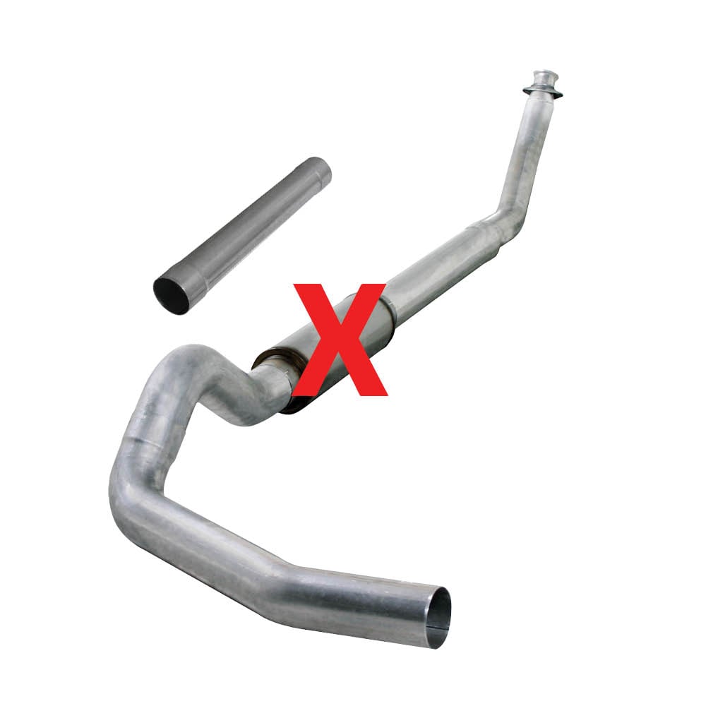 No Muffler / Straight Pipe: For those that want the uninhibited sound of straight pipe, here it is. This is a complete kit, but instead of shipping with a muffler, you will receive an eliminator pipe to give you the exhaust bark you're after. If you ever want to put a muffler back into the system, you'll merely need to remove the eliminator pipe and install a proper length muffler.