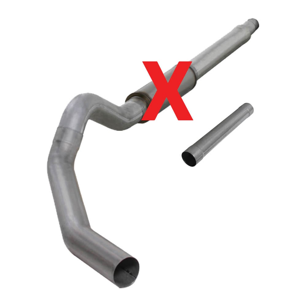 No Muffler / Straight Pipe: For those that want the uninhibited sound of straight pipe, here it is. This is a complete kit, but instead of shipping with a muffler, you will receive an eliminator pipe to give you the exhaust bark you're after. If you ever want to put a muffler back into the system, you'll merely need to remove the eliminator pipe and install a proper length muffler.
