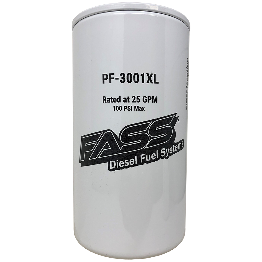 Replace your existing FASS fuel separator filter with this Extended Length Particulate Fuel Filter. This filter is rated at 144 microns. Placing this fuel filter on the suction side will drastically reduce cavitation, increase flow properties, lower the sounds output of the system, and removes larger fuel particulates. This filter MUST be used in conjunction with the XWS-3002XL. This filter will not work with any other filter. IMPORTANT NOTE: The new PF-3001XL MUST be used in conjunction with the XWS-3002XL. The new filters cannot be used in combination with the FF-3003/FF-3010 or FS-1001/FS-1020. When replacing the discontinued filters with the new XWS-3002XL and PF-3001XL, the XWS-3002XL will now be placed on the pressure side of the pump and the PF-3001XL will be placed on the suction side. PLEASE SEE THE LOCATION DIAGRAM ON THE NEW FILTERS FOR PROPER FILTER PLACEMENT. This filter will fit either the FASS Titanium Series with the GRAY filter base or, the FASS Signature Series Pumps with the BLACK filter base. NOTE: to get FASS warranty coverage for your product you must fill out their registration form here.