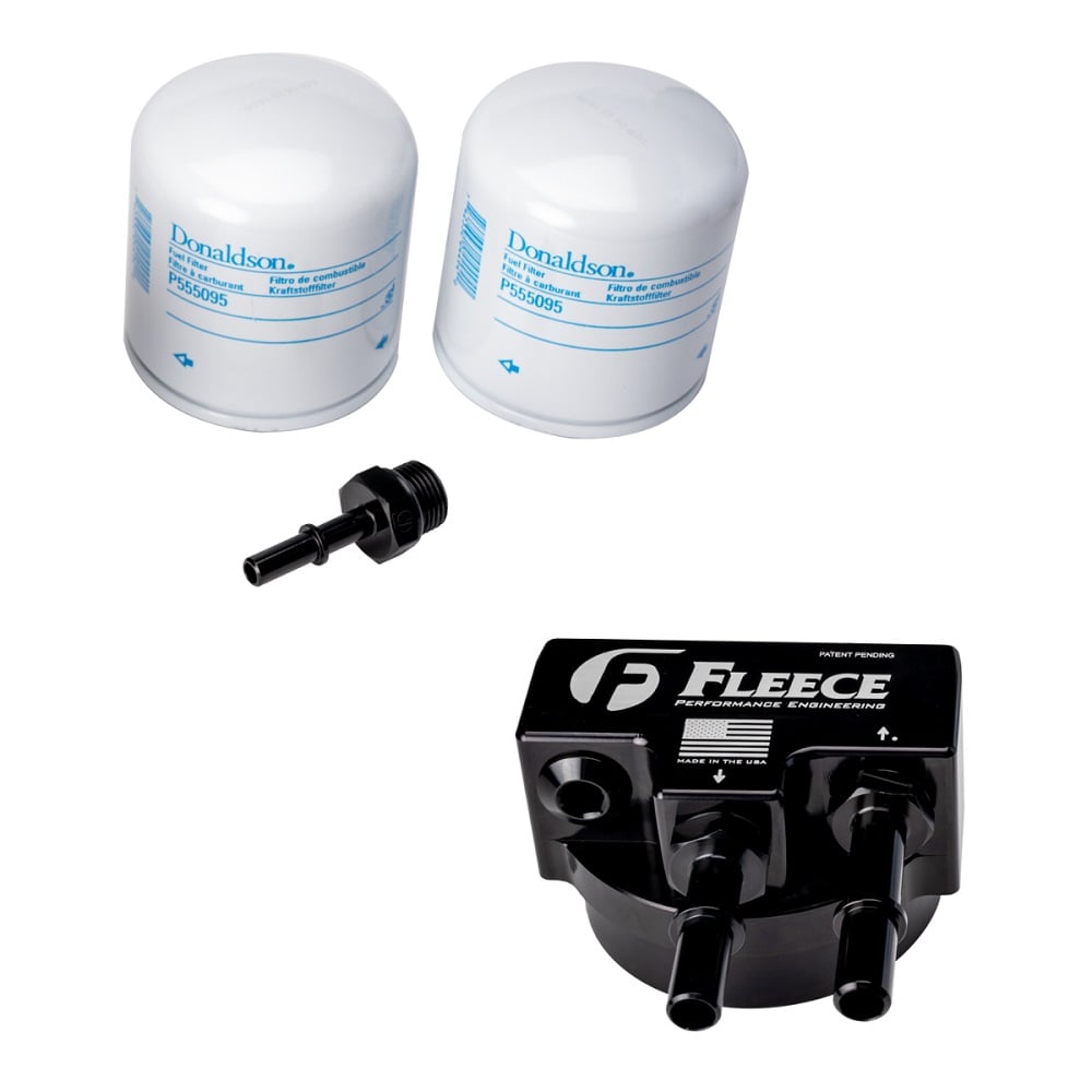 Behold! The Fleece Performance Engineering under hood filter replacement assembly for your Ford F250/350/450 6.7L Powerstroke! Plastic Original Equipment filters are prone to cracking and fuel leakage and that won't do. Eliminate the risk of a cracked filter with FPE's billet aluminum cap assembly matched with billet aluminum quick disconnect fittings. The drop-in replacement filter assembly locks directly into your stock filter location and utilizes a replaceable spin-on Donaldson filter that is easily serviceable. The kit includes an extra Donaldson fuel filter, further extending the time before you need to purchase an additional filter, letting you use every gallon of fuel you paid for.