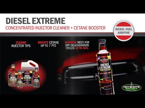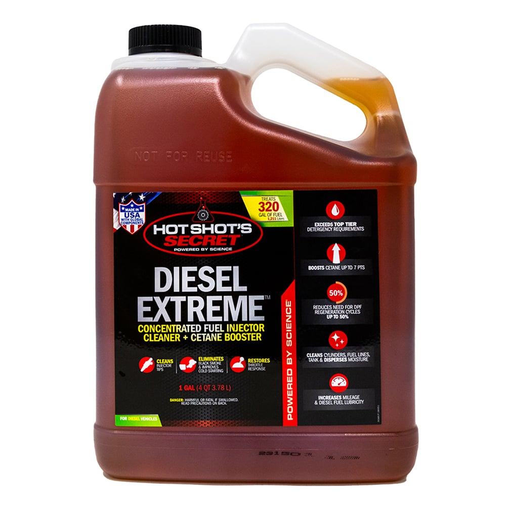 Hot Shot's Secret® Diesel ExtremeTM Clean & Boost is a fully formulated and concentrated fuel system cleaner and engine cleaner. Designed to remove deposits and improve the performance of all types of diesel engines, from semi-trucks to RVs, this diesel injector cleaner removes all internal diesel injector deposits (IDIDs) and external diesel injector deposits (EDIDs) as well as waxy and polymeric deposits that can clog the fuel filter. Our powerful diesel additive and fuel cleaner cleans out injector tips, cylinders, fuel lines, and tanks, all while dispersing moisture to deliver a more efficient system. Once the fuel system is clean, Diesel ExtremeTM contains several premium additives to enhance performance. A cetane boost can improve cetane ratings by 7 points for better combustibility, fuel economy, and horsepower. With improved combustibility, you can reduce the number of diesel particulate filter (DPF) regeneration cycles required. Use 8 oz per 20 gallons of diesel fuel. Add during fuel up and run every 6,000 miles for best results. For use in all diesel engines.