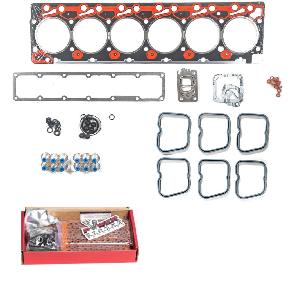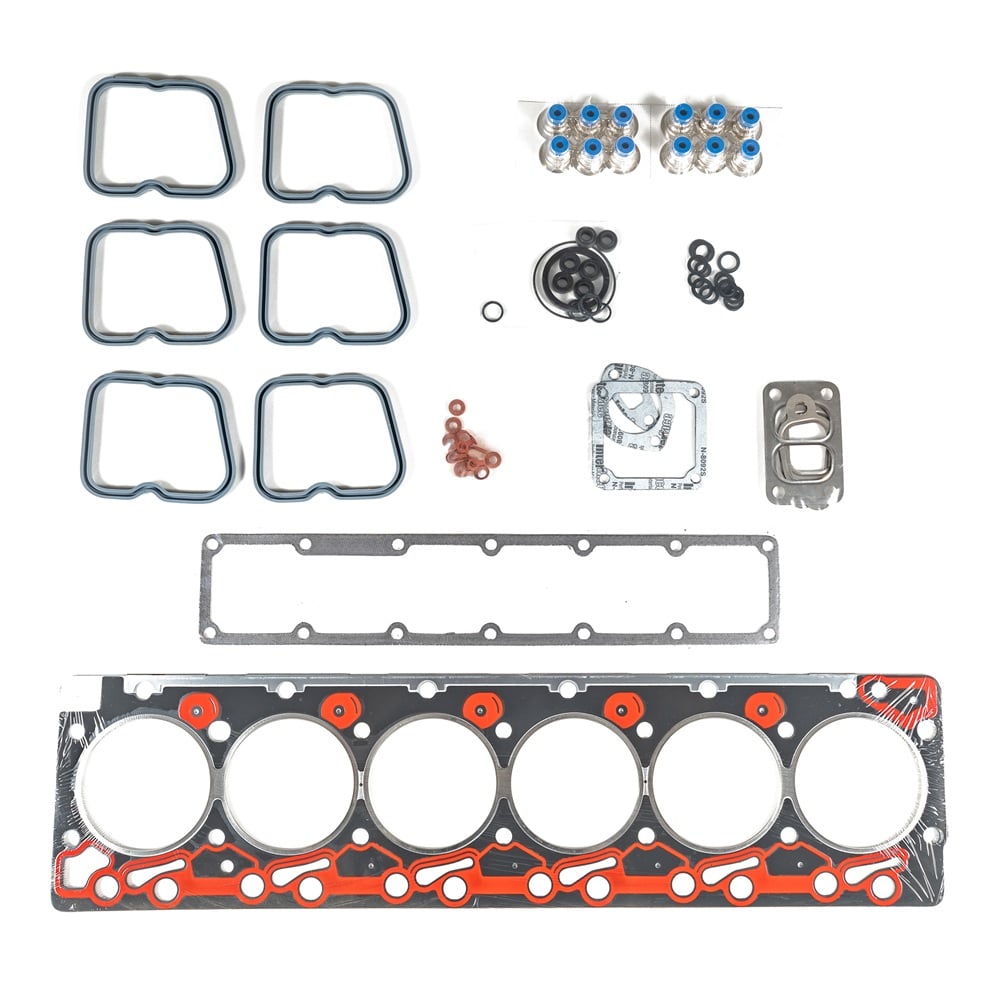 Whether you're fixing a blown gasket or prepping for more power, this kit includes everything needed for a solid, leak free top end. This set comes with a standard-size head gasket, injector O-rings, valve cover gaskets, exhaust manifold gaskets, valve stem seals, turbo drain gasket, thermostat housing gasket, turbo to manifold gasket, intake plenum gasket, and intake manifold gaskets, giving your Cummins the essential seals it needs for long lasting performance.