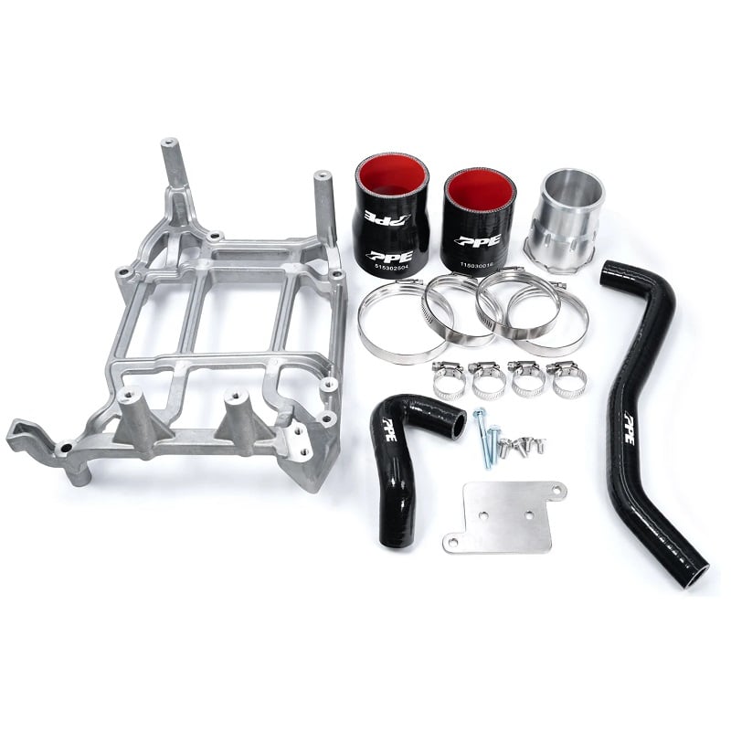 The largest benefit to an upgraded intercooler is the cooler and denser charge air helps reduce exhaust gas temperatures and increases fuel economy. It also significantly improves the airflow and lowers the pressure drop by up to 17%, which results from the flow-optimized, cast aluminum end tanks and a 77 percent less restrictive core structure. This kit comes complete with a die-cast support bracket, a billet aluminum turbo adapter that replaces the turbo resonator, and PPE Performance Silicone Couplers and Coolant Hoses.