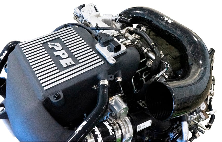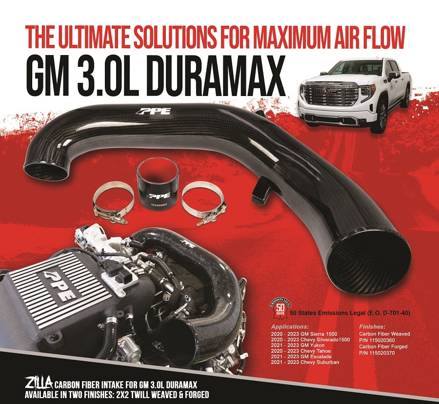 The PPE Zilla Carbon Fiber Intake Tube is an excellent performance upgrade for your Duramax engine. It is handcrafted from 100% genuine carbon fiber and finished with a sleek clear coat. Through extensive testing and calibration, PPE has achieved a design that reduces pressure drop by 73% and optimizes airflow, resulting in improved engine performance and turbo efficiency. Replace your restrictive stock intake and experience faster throttle response, noticeable torque gain, and unmatched build quality!