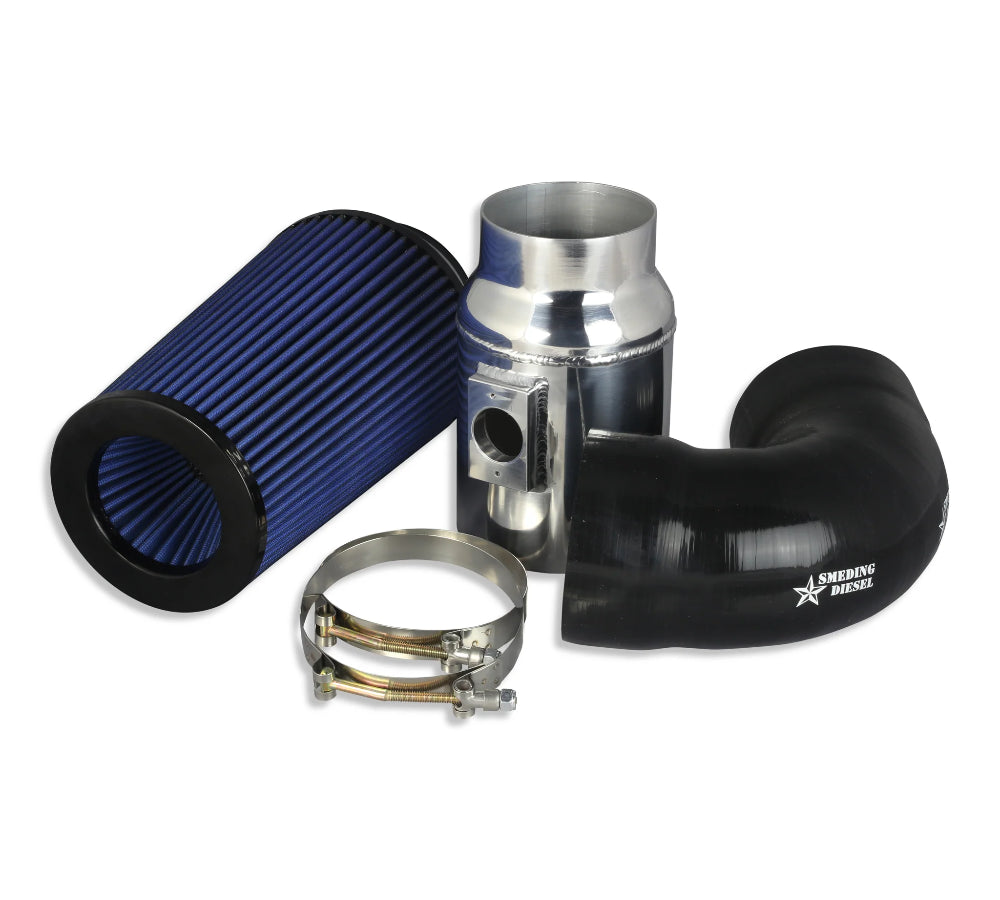 For those who have upgraded to the S300 single turbo setup on their 6.4L Powerstroke, why stop there? You have already removed a problematic area of the engine in the factory twin-turbo setup, upgrade your air intake system too as the cherry on top. You've upgraded your turbo and now we want to make sure this unit is getting restriction-free air. Smeding Diesel's S300 Air Intake is a complete system that bolts directly to the front of single turbo featuring aircraft aluminium construction, and comes with heavy-duty silicone boots and the 4" clamps needed to snug it all together. Don't stop at the turbo, finish the job right and make sure it is getting the clean air it deserves.