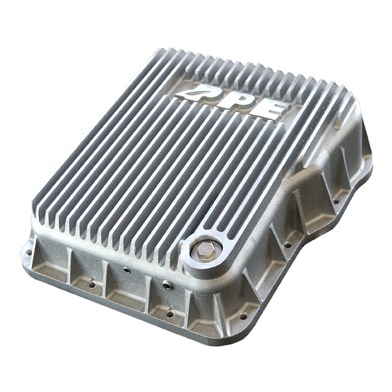 Thanks to the 3/4 inch external cooling fins, the fluid will run much cooler than the stock pan. The PPE pans are tough, too! No, you cannot use them as a skid plate, but thanks to its thick cast construction with external fins and the additional side ribbing, all PPE Transmission Pans are much stronger than the stock units. Each pan is equipped with 1/8 inch and 1/4 inch NPT threaded ports for easy installation of gauge sensors as well as one of PPE's Neodymium magnet equipped 17mm hex head drain plugs. The Neodymium magnet is an insanely strong magnet that attracts and holds harmful metal particles floating in your oil. New Stainless Steel Allen head mounting hardware is supplied. The PPE Standard Profile Aluminum Transmission Pan is perfect for hot rod or marine applications.