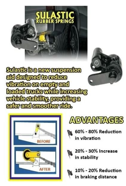These Sulastic Rubber Springs/Shackles will reduce the overall vibration on empty and loaded trucks. They also increase the overall stability of the vehicle granting it a smoother and safer ride. Sold in pairs.