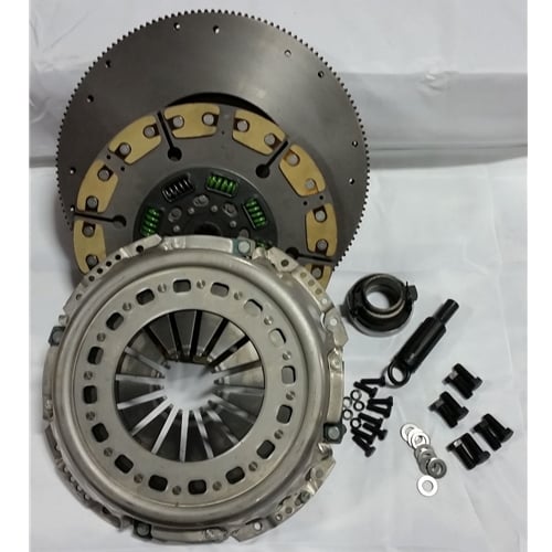One of the easiest ways to get increased holding power from a clutch is to increase the surface area, right? Well, the factory NV4500 featured a 12-1/4" diameter facing, where the later 6 speed NV5600 jumped to a 13" so wouldn't it make sense to upgrade to a 13"? Sure it does! Valair offers this upgraded clutch kit specifically for 5 speed NV4500's that converts it to a 13" clutch disc and features a heavy duty spring hub that can handle up to 500 horsepower due to its Kevlar and ceramic facings. MORE INFORMATION: Utilizing two different buttons on the clutch disc these clutches are aimed at the moderate performance trucks. Driving manners are very good for everyday driving and towing. Take-offs are relatively smooth and offer more slip and forgiveness than the ceramic/ceramic clutches. While the holding power for the Kevlar faced clutch is higher than the organic/organic faced clutches, the main advantage is less wear on the flywheel and longer life. Pedal pressure is typically a little higher than factory pedal pressure. Drive train upgrades are not usually required. Some clutch rattle may be noticed while idling in neutral due to the HD Hub Design. Ideally suited to trucks with moderate performance power modifications with 350-500HP.